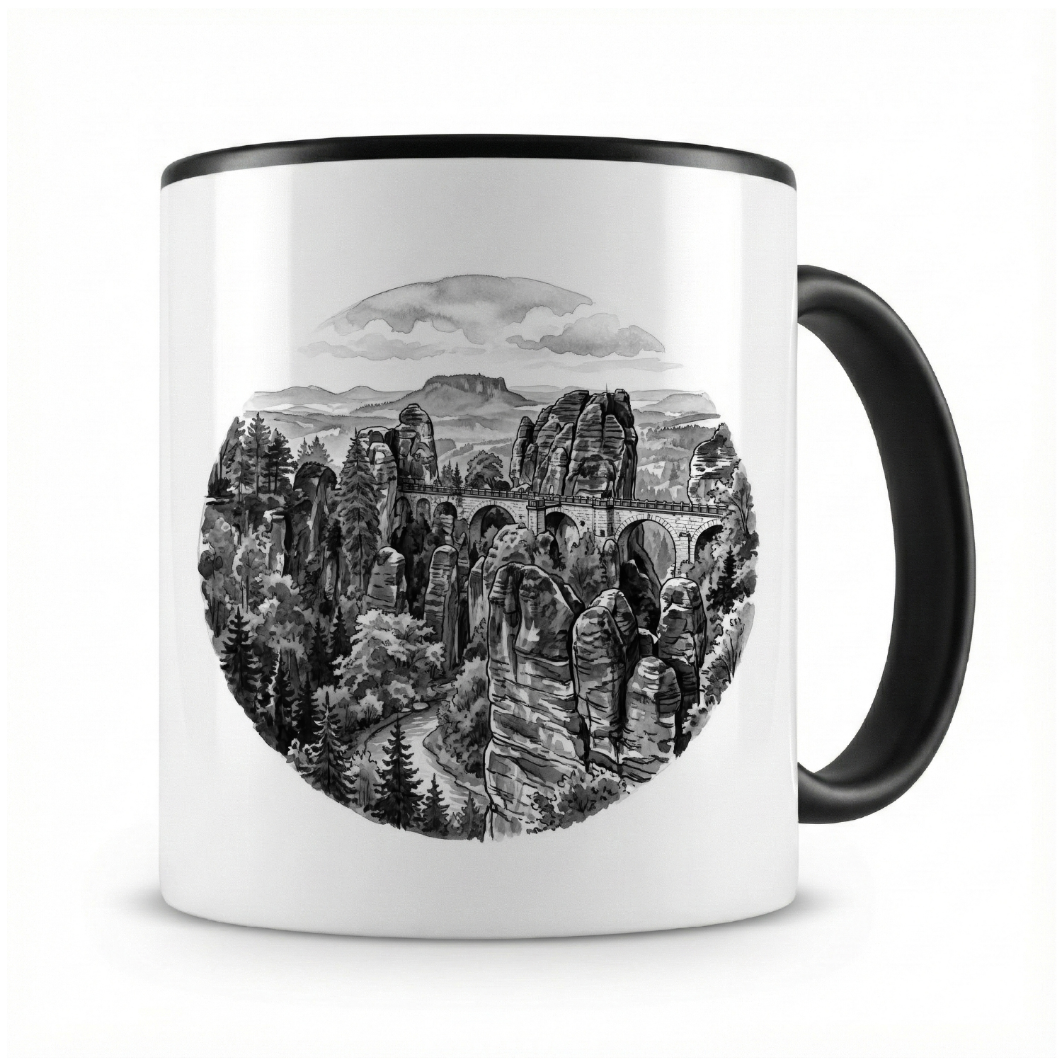 Stell dir vor, du startest deinen Tag mit einer großen, warmen Tasse Kaffee oder Tee – und jedes Mal, wenn du sie in die Hand nimmst, zaubert dir das liebevolle „Basteibrücke aus Deutschland Sächsische Schweiz“-Motiv ein Lächeln ins Gesicht. Genau das macht die Kaffeetasse von Samunshi so besonders.
