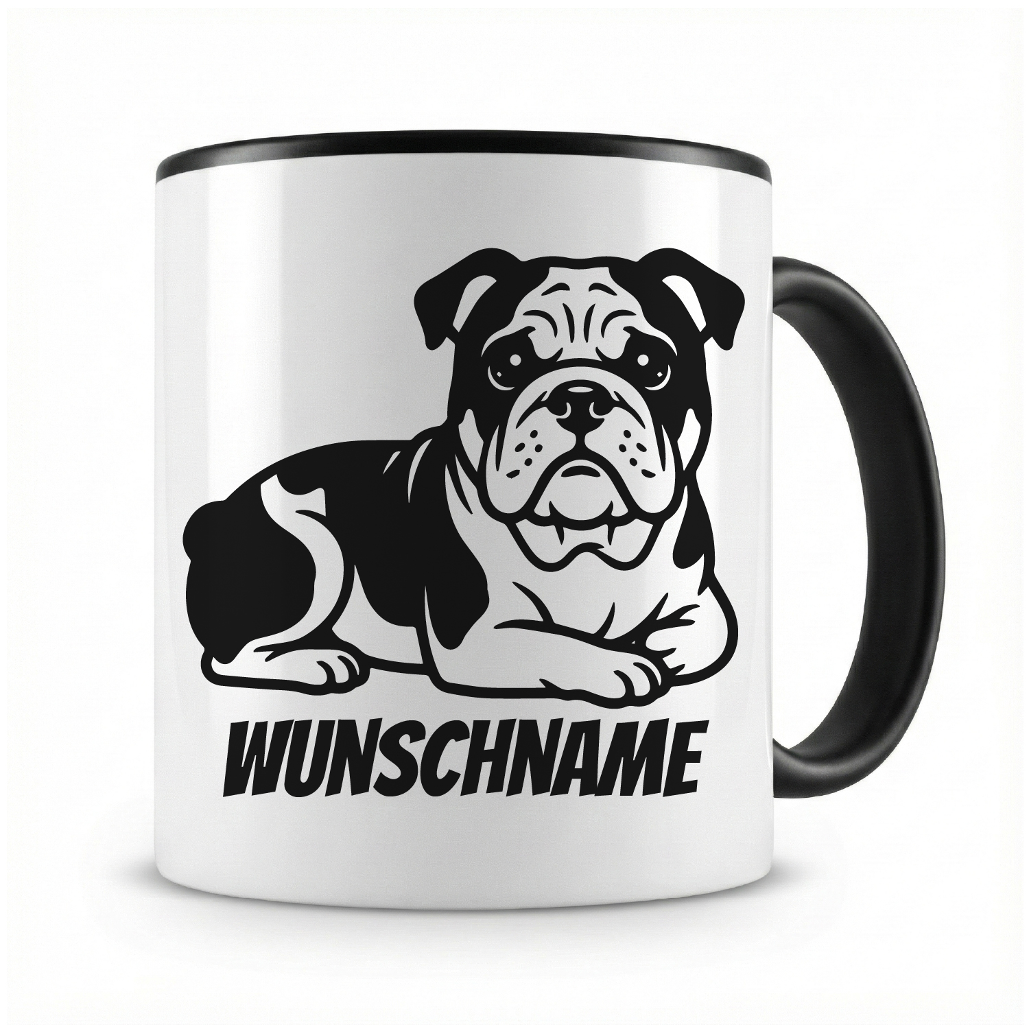 Eine Tasse bedruckt mit Bulldogge mit Name