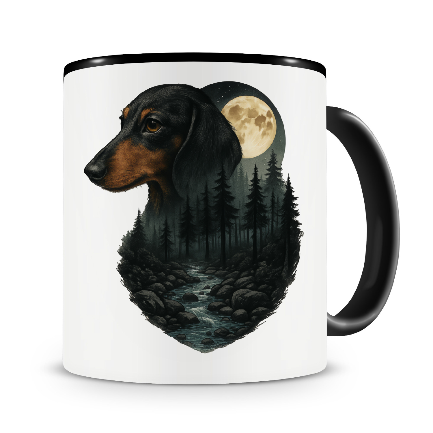 Eine Tasse bedruckt mit dem Motiv Dackel im Mondlicht