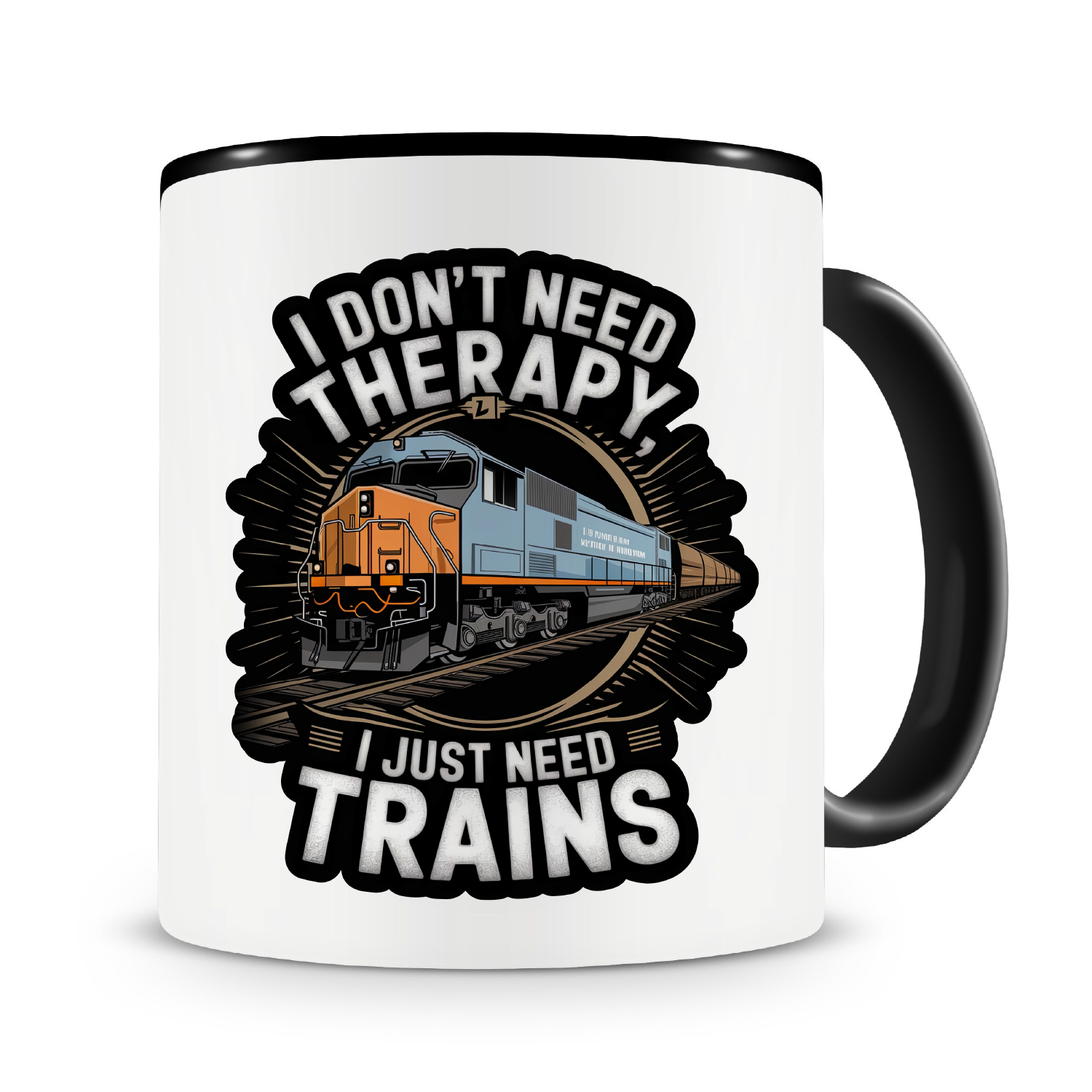 Eine Tasse bedruckt mit dem Motiv Don't need Therapy just Trains