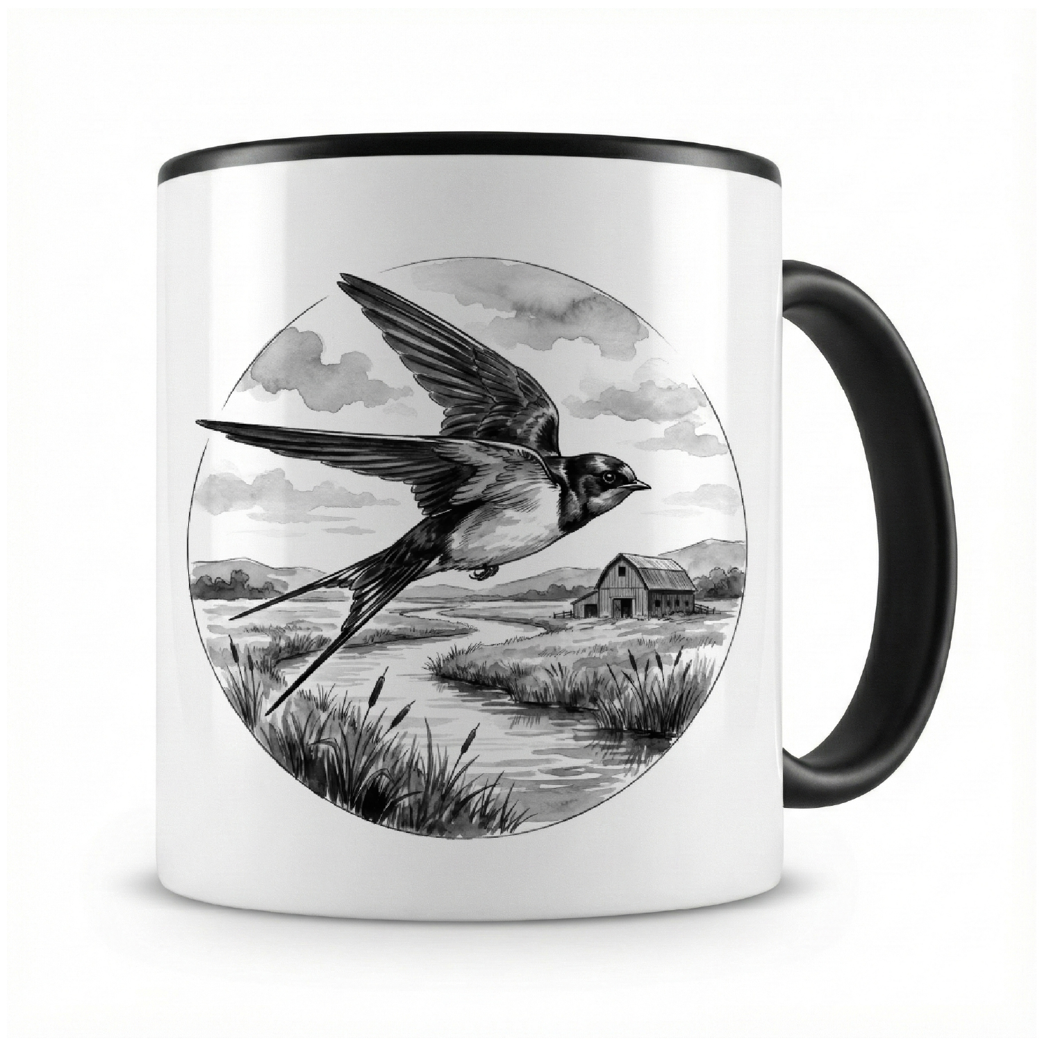 Eine Tasse bedruckt mit dem Motiv Schwalbe in der Wildnis