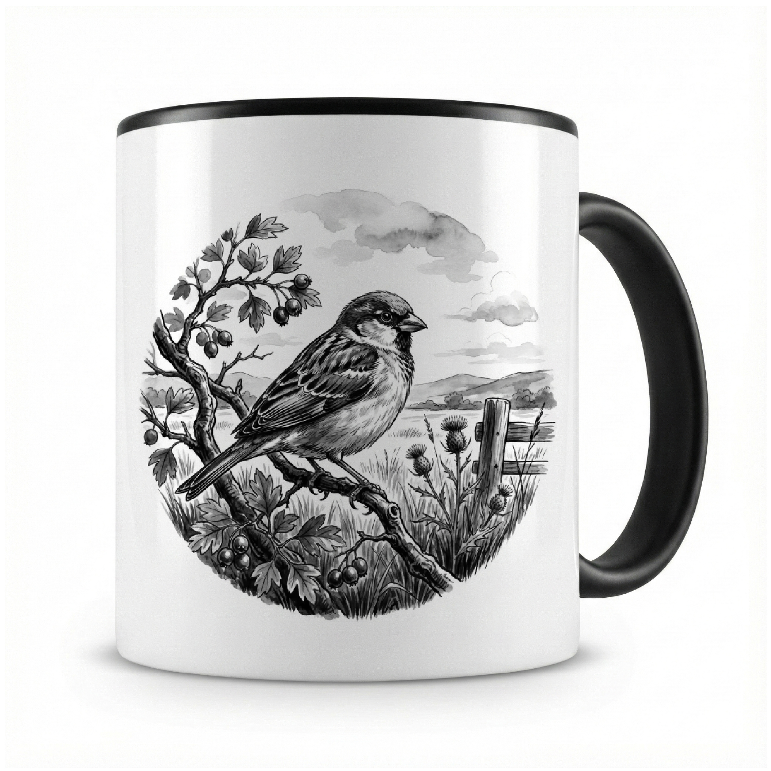 Eine Tasse bedruckt mit dem Motiv Spatz in der Wildnis
