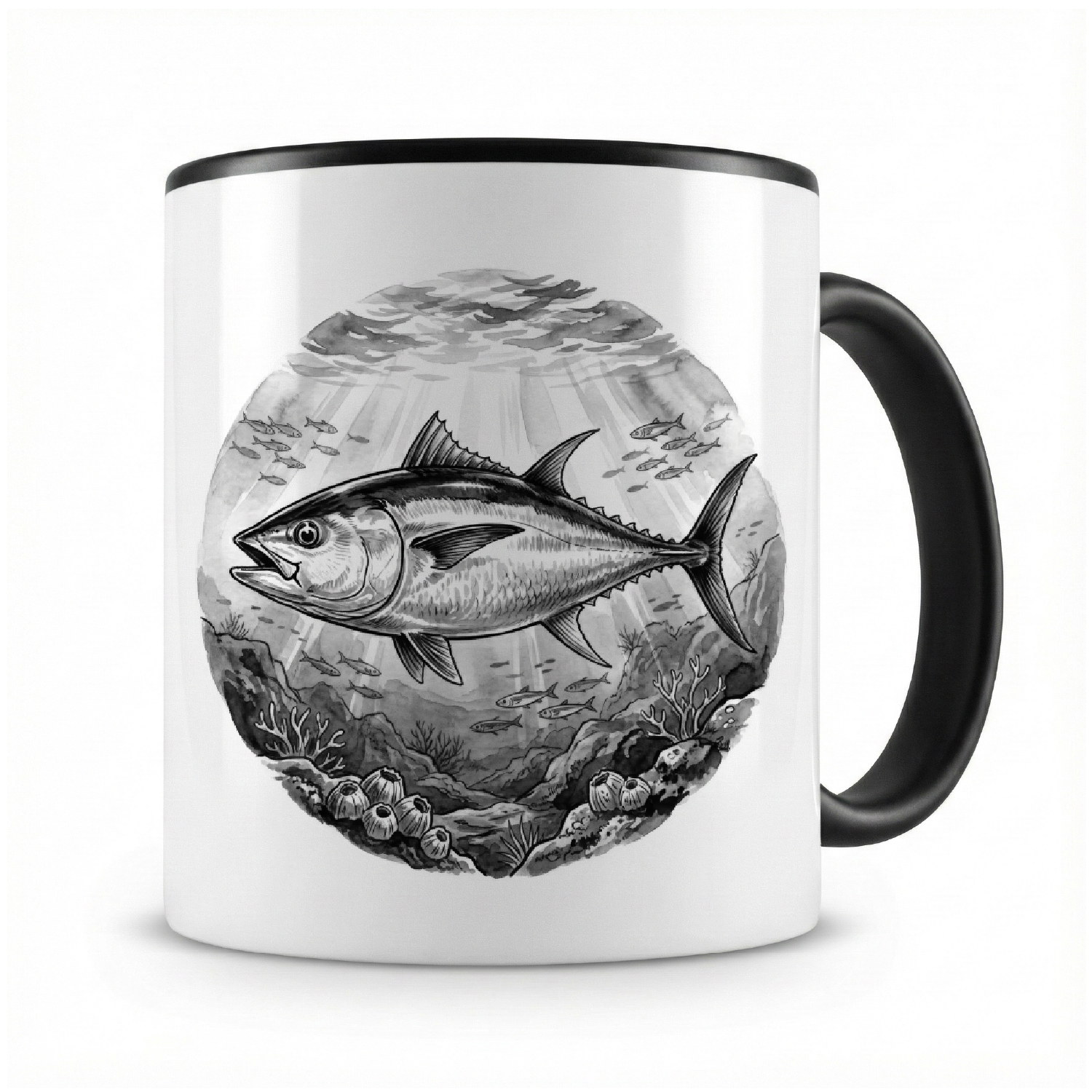 Eine Tasse bedruckt mit dem Motiv Thunfisch in der Wildnis