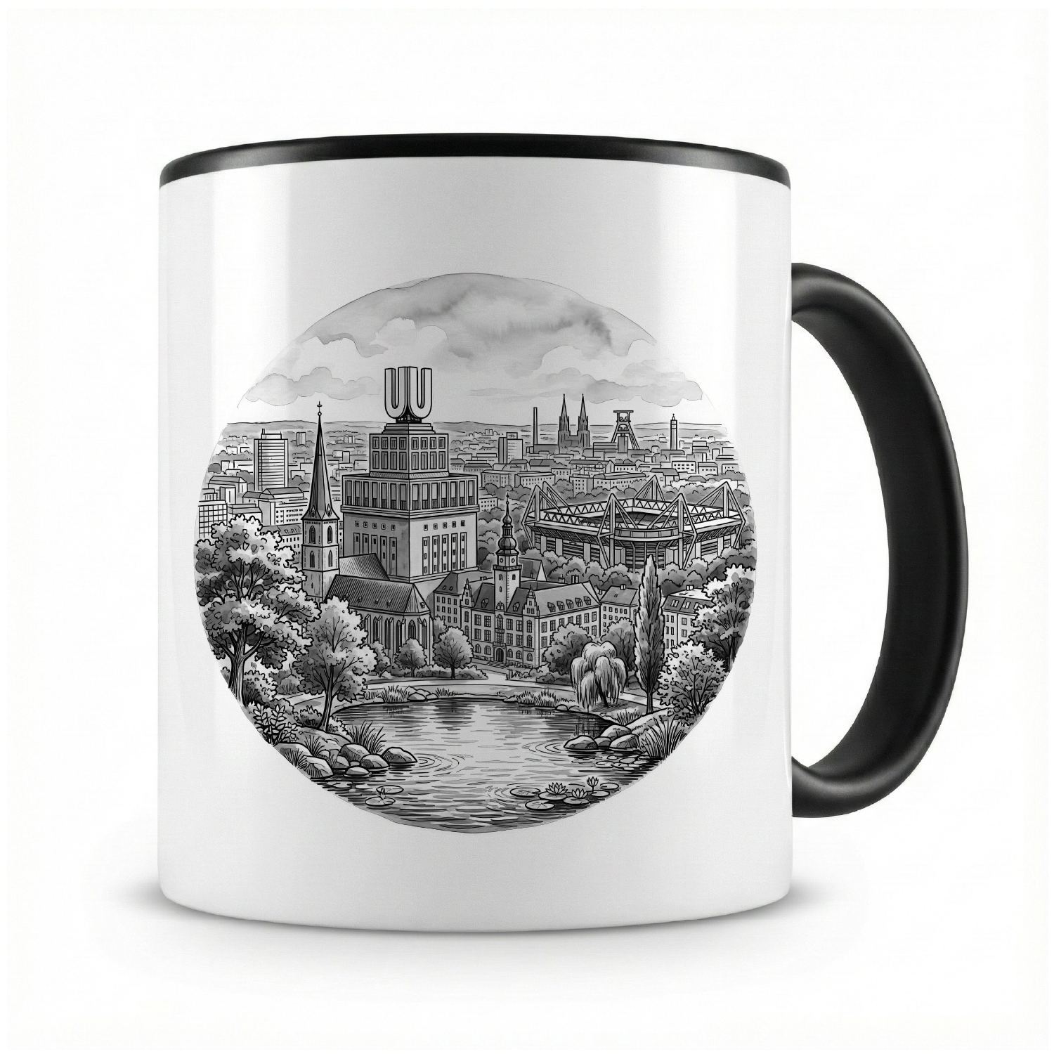 Stell dir vor, du startest deinen Tag mit einer großen, warmen Tasse Kaffee oder Tee – und jedes Mal, wenn du sie in die Hand nimmst, zaubert dir das liebevolle „Stilisierte Dortmund Skyline“-Motiv ein Lächeln ins Gesicht. Genau das macht die Kaffeetasse von Samunshi so besonders.