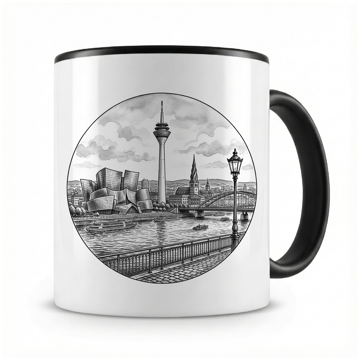 Stell dir vor, du startest deinen Tag mit einer großen, warmen Tasse Kaffee oder Tee – und jedes Mal, wenn du sie in die Hand nimmst, zaubert dir das liebevolle „Stilisierte Düsseldorf Skyline“-Motiv ein Lächeln ins Gesicht. Genau das macht die Kaffeetasse von Samunshi so besonders.